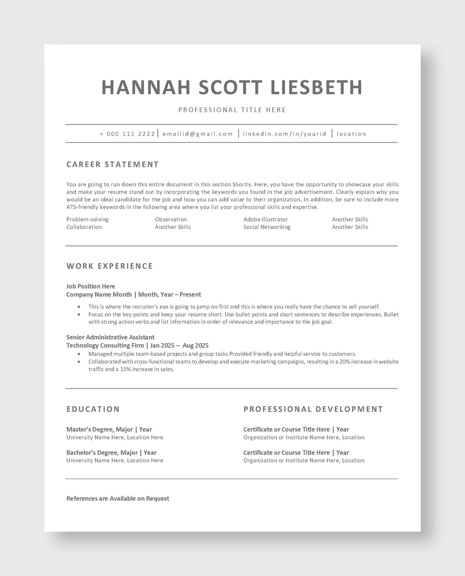 This Professional resume template is specifically created to make the job application process seamless. With a professional layout and easy to edit design, it helps you craft a compelling resume that highlights your strengths. Impress hiring managers and land your dream job with this ATS Friendly Resume Template! Perfect for professionals who value simplicity, clarity, and a polished look. Start your career journey today!